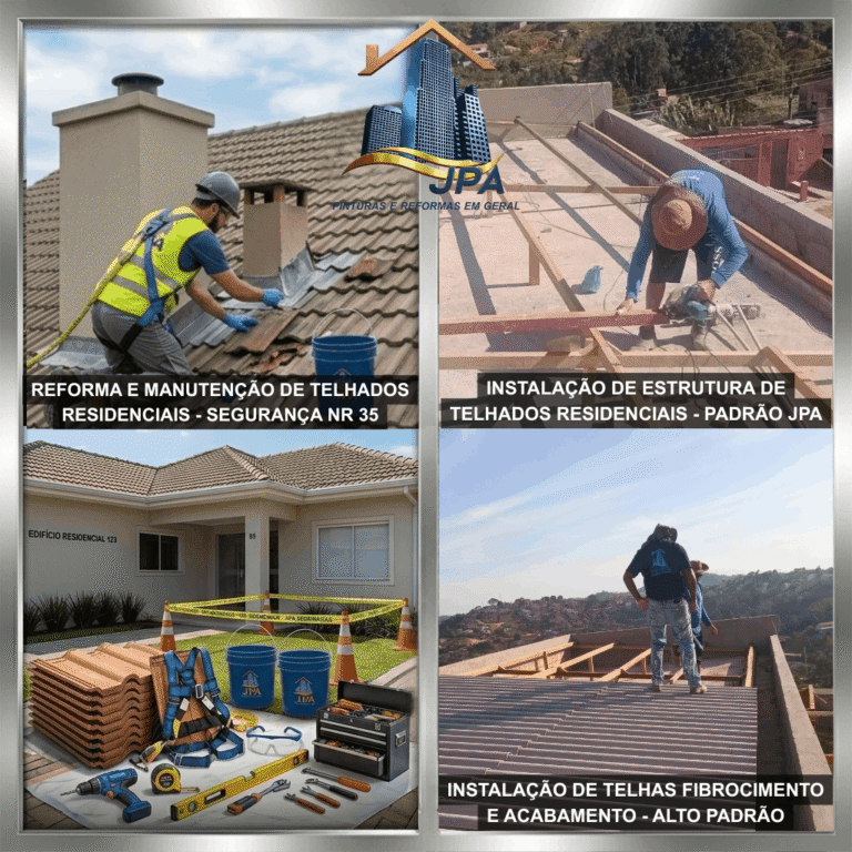 Nosso Diferencial Técnica e Segurança: Trabalhar em telhados é uma atividade de altíssimo risco. Na JPA, esse serviço é executado exclusivamente por profissionais com certificação NR 35 (Trabalho em Altura) e sob supervisão técnica constante. Utilizamos linhas de vida, cintos de segurança tipo paraquedista e todos os EPCs necessários (conforme NR 18), garantindo que a reforma seja feita com qualidade, mas acima de tudo, preservando a vida dos trabalhadores e a integridade da edificação.
